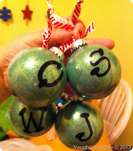I’m keeping up the tradition of making ornaments for the kids. I made these glitter ornaments with their initials on them. I used plastic ornaments. I filled them with glue and dumped the glitter inside. The initials are stickers.